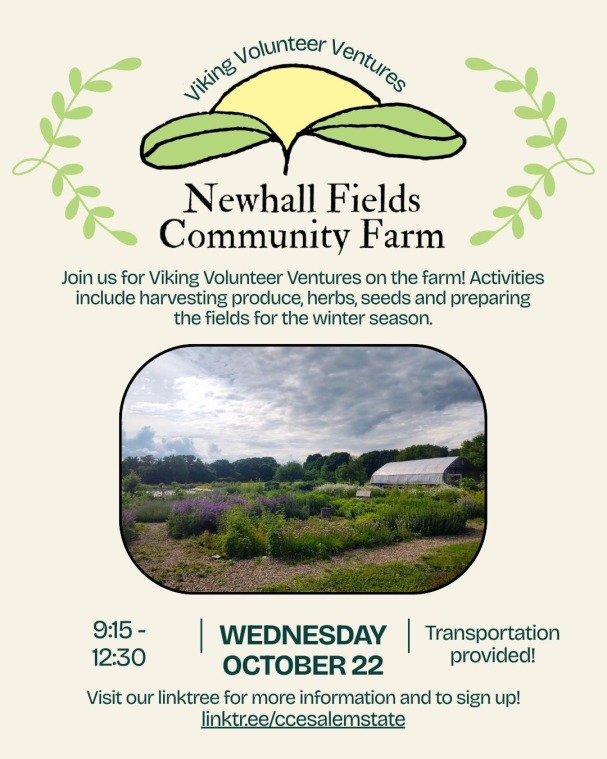 Join us, as we go to Newhall Fields to work on the farm! Activities could include harvesting produce, herbs, seeds and preparing the fields for the winter season. We will meet in Dunks on North Campus at 9:15 am prior to departure and arrive back to campus at 12:30 pm. Breakfast items will be provided. Volunteering takes place from 10-12 pm. If you DO NOT need transportation to the farm please let Kate or the CCE team know and arrive at Newhall Fields Farm NO later than 10 am.